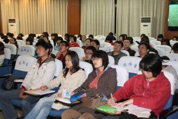 2010年10月28日晚上七点半,在成都市社科联,成都日报和成都翻译协会及成都体育学院英语协会同学们的共同努力下,主题为“外语翻译学习和实战经验交流—成都翻译协会走进成都高校系列讲座”在成都体育学院同传室如期举行,虽然成都这几天天气寒冷,但是丝毫没有影响体育学院同学们的积极性,同传室里仍然坐满了同学。成都体育学院是本次巡校讲座的第二站,讲座围绕笔译学习和经验交流及口译学习和经验交流展开,首先,成都翻译协会范老师与大家分享了近年来高校学生的就业情况,并分析了翻译的就业方向和市场前景,随后成都翻译协会笔译教师给大家分享了笔译的学习技巧和实战经验,使大家明白了笔译并不是一个轻松的工作,而是一个不断地积累,不断地学习的过程。口译老师的分享吸引了现场许多同学的目光,炫目的照片使同学们对口译工作更加好奇也充满了敬仰。在讲座的过程中,体院学子们积极与老师互动,使整个讲座过程变得更加生动。讲座结束以后,同学们走到前排与老师探讨问题,分享知识,使老师们倍感欣慰。