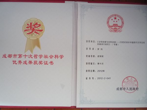 在12月25日召开的“成都市第十次哲学社会科学优秀科研成果颁奖大会”上,成都翻译协会/四川西部文献编译研究中心评选推荐的协会常务理事、西南财经大学经贸外语学院副教授罗列著《女性形象与女权话语— 20世纪初叶中国西方文学女性形象译介研究》获得市政府二等奖;协会高级会员王增辉教授著《城市园林文化方略》获优秀成果奖。受到表彰。
